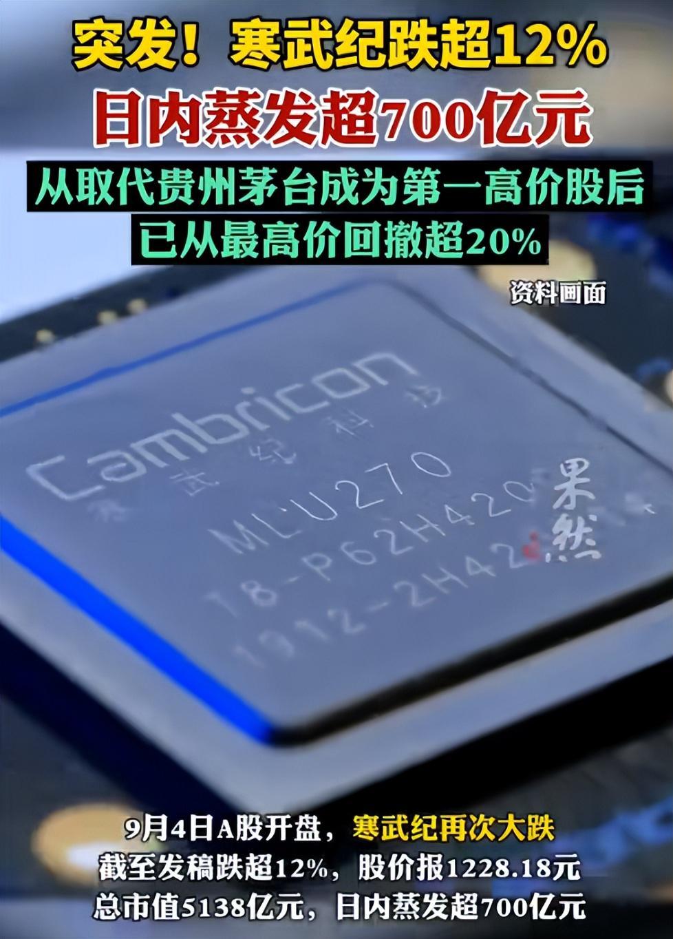 短短一天内,其市值就蒸发了超过700亿元,而从最高点的近7000亿市值计算,寒武纪在不到一周时间里跌去了1600多亿。